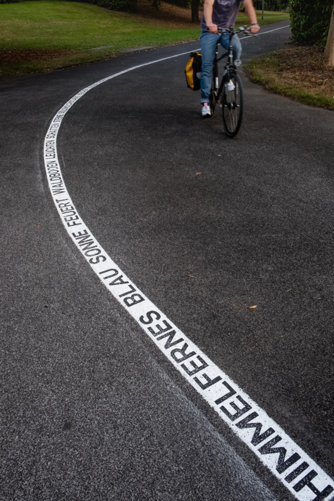 Die auf dem Weg zwischen Parkgürtel und Wöhlerstraße vorgefundene Mittelstreifenmarkierung ist nur noch rudimentär vorhanden, die Wegqualität ist mittelprächtig, der Weg aber stark genutzt durch Fußgänger, Jogger, Fahrradfahrer jeden Alters. craus | hahn reaktivieren den weißen Bodenmarkierungsstreifen. Die entstandene leuchtende Linie nutzen sie als Feld für einen Text, welcher eine Abfolge von Wahrnehmungen, Atmosphären, Handlungen beschreibt, die die Vorstellungskraft anregen und ein assoziatives Spiel eröffnen, das mit jedem Mal entlanglaufen, -fahren, -gehen, -schlendern andere Bilder hervorrufen kann. Durch die klare ästhetische Markierung des Weges entsteht eine Passage des Gedankenaustauschs aller Nutzer*innen des Areals. Sandy Craus und Sebastian Hahn sind während der CityLeaks-Wochenenden vor Ort und drucken den Text. Laufpublikum ist willkommen. Follow the Line.