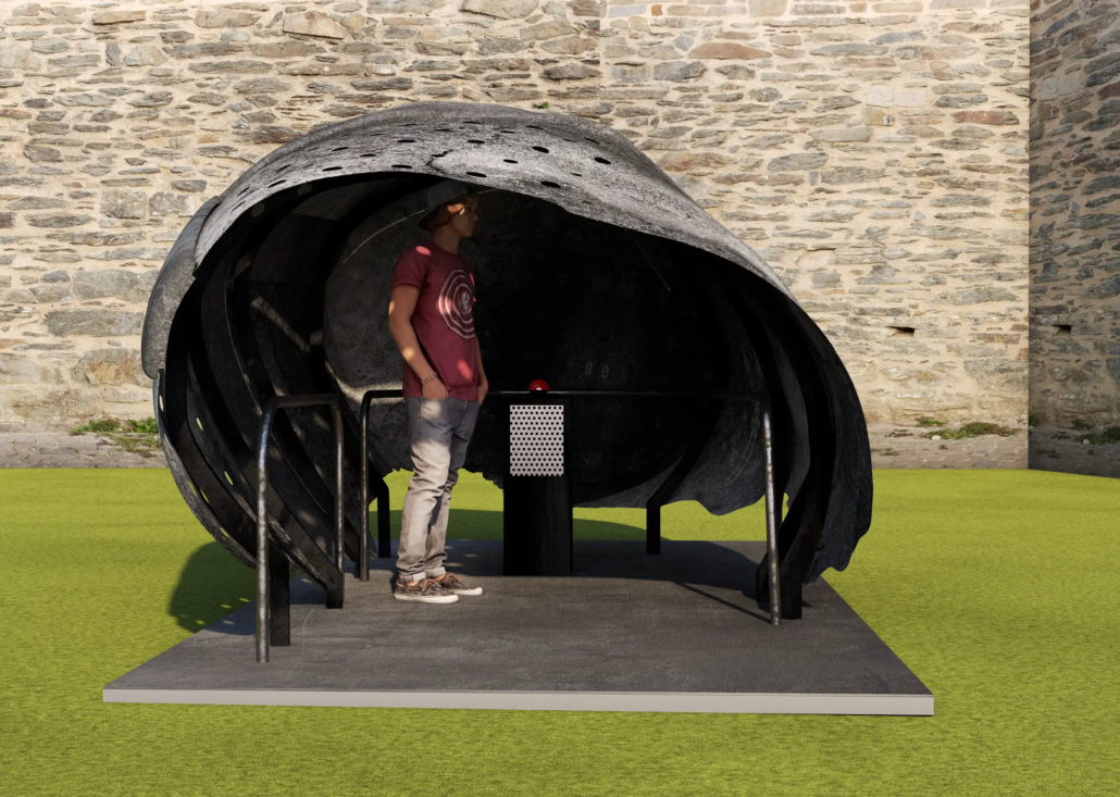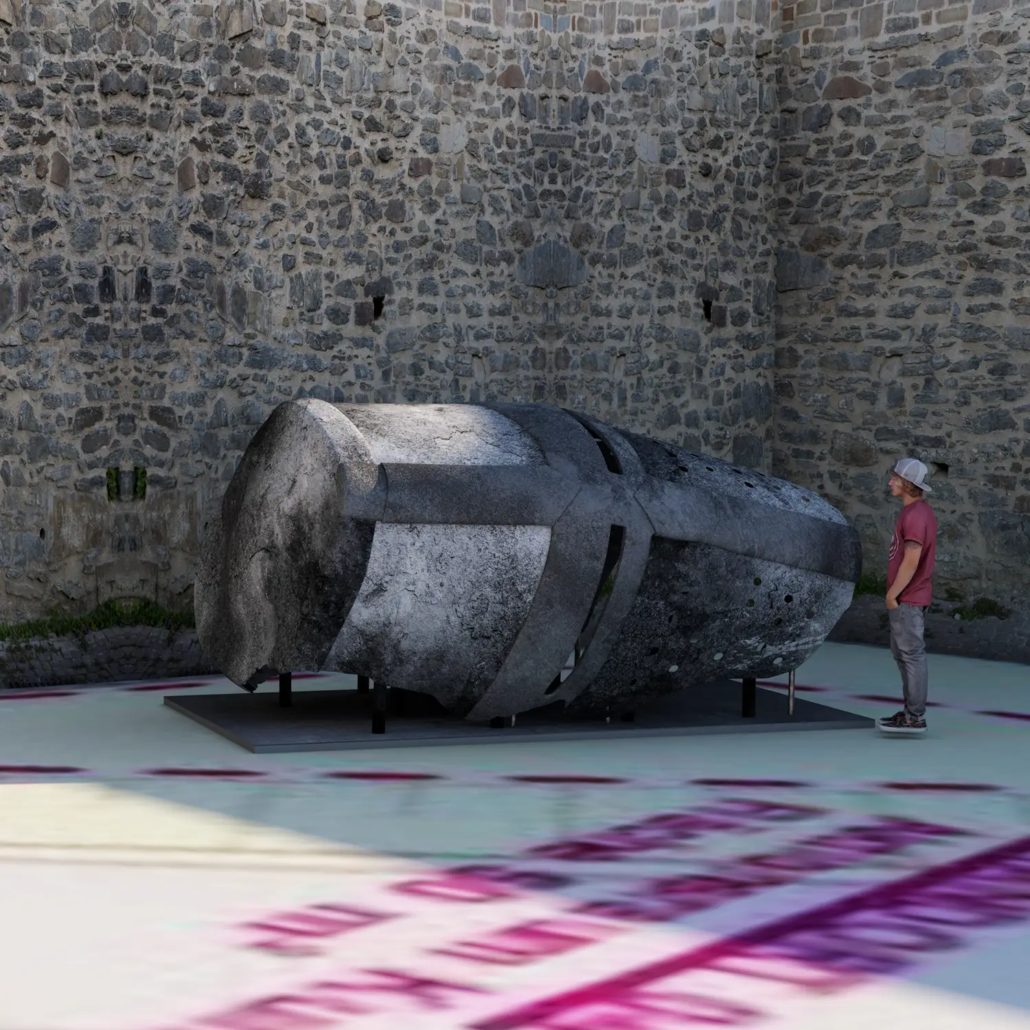 Im Inneren eröffnet sich ein kleiner Klangraum mit einer eindrucksvollen Soundinstallation. Über eine integrierte Soundsäule ertönen Turniergeräusche – das Klirren von Schwertern, Hufgetrappel, Atem, Herzschlag und Ausrufen machen das Erleben mittelalterlicher Kampf- und Turnierszenen körperlich spürbar.