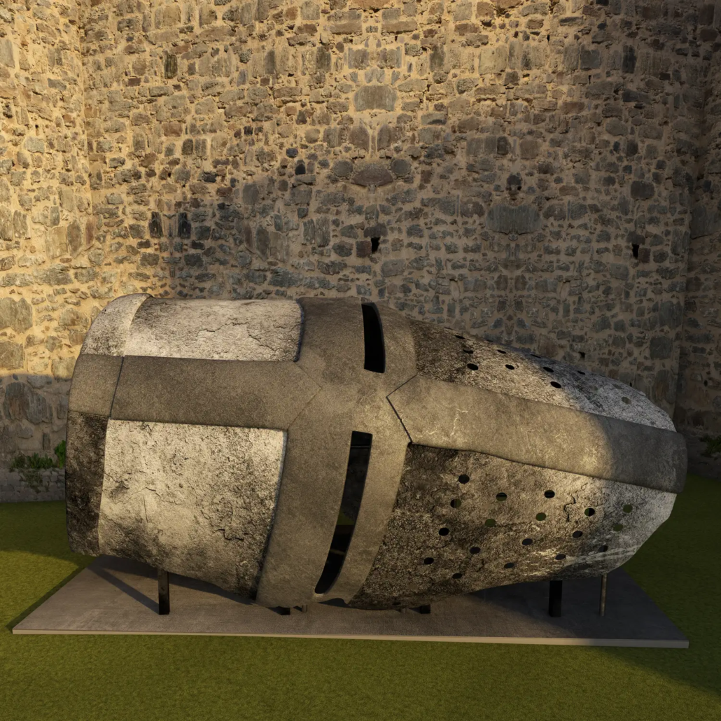 Dieser überlebensgroße Topfhelm ist inspiriert vom „Dargener Helm“ aus dem 13. Jahrhundert, einem historischem Zeugnis der Zeit der Ritter und Turniere.